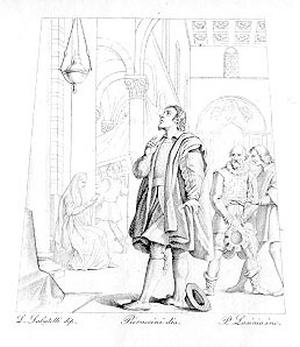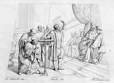 [A destra: L’invenzione del telescopio con l’offerta fatta al Doge e alla Signoria di Venezia (incisione di Paolo Lasinio tratta dall’affresco di Luigi Sabatelli)]