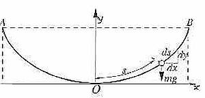 [A destra: Una massa m scivola, senza attrito, sull’arco di cicloide OB]