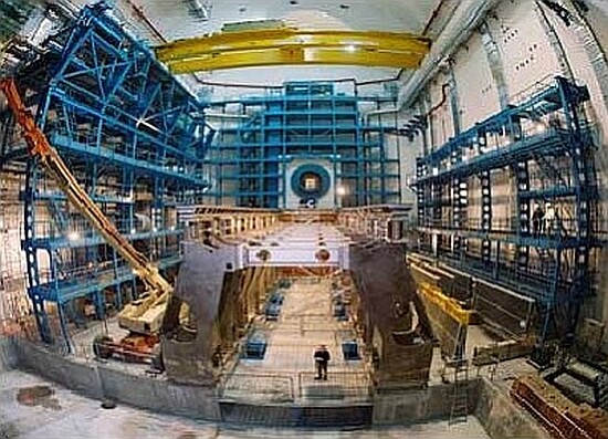 La grande caverna dell’ATLAS nel marzo 2004, pronta a ricevere il toroide dell’ATLAS; al centro il tunnel di LHC.