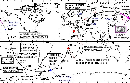 Tutte le fasi di volo furono completamente automatiche (il pilota avrebbe avuto delle parziali possibilità di intervento solamente in caso di gravi emergenze), compresa la fase di rientro che iniziò quando la capsula si trovava ancora sull’Africa, per concludersi nel sud della Unione Sovietica, non lontano della città di Engels, nella regione di Saratov.