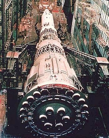Utilizziamo per semplicità questo termine, ma in realtà i sovietici non accettarono mai ufficialmente la sfida che il presidente americano J.F. Kennedy aveva lanciato, prima di tutto alla NASA, ma indirettamente anche a loro, col suo famoso discorso del 25 maggio 1961: «[…] questa nazione dovrebbe impegnarsi a raggiungere la meta, prima che questo decennio sia finito, di sbarcare un uomo sulla Luna e di riportarlo sano e salvo sulla Terra». [Immagine a destra: il missile N1 con i suoi 30 motori]