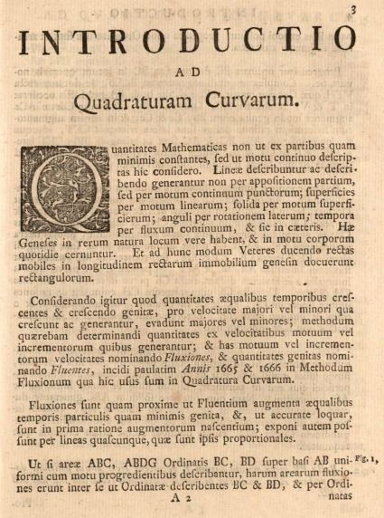 - Le prime parole del trattato di Newton De quadratura curvarum, dedicato al calcolo integrale e differenziale, sono: «Qui considero le grandezze matematiche non composte da piccolissime parti costanti, ma descritte per moto continuo. Le linee sono tracciate, e nel tracciarle sono generate, non per apposizione di parti, ma per moto continuo dei punti; le superfici sono generate dal moto di linee; i solidi dal moto di superfici; gli angoli per rotazione dei lati; eccetera».