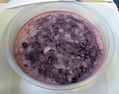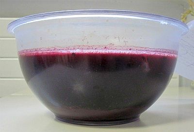 Vuotiamo il mosto dalla bottiglia in un catino. Il succo è rosso scuro, bordeaux.