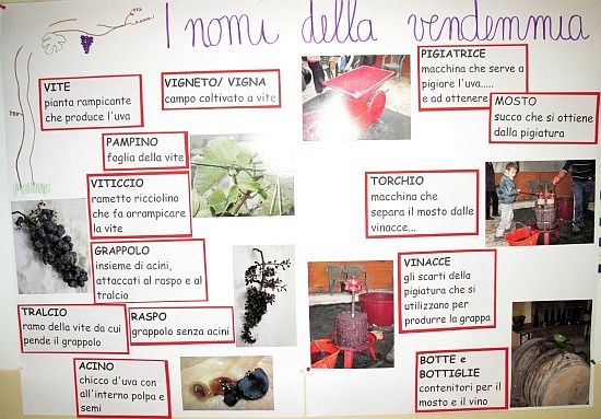 Durante l’open day i bambini hanno tenuto una lezione ai genitori in cui abbiamo letto il testo, raccontato le parole studiate tramite due cartelloni attacca – stacca e raccontato i cambiamenti del mosto corredati da una proiezione di foto.