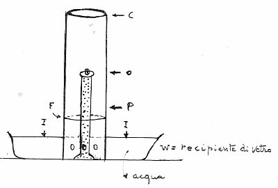 W è un recipiente contenente acqua, appoggiato su un banco; P è una colonna di sopporto solidale con W.