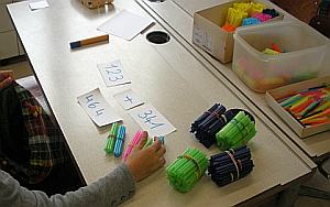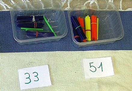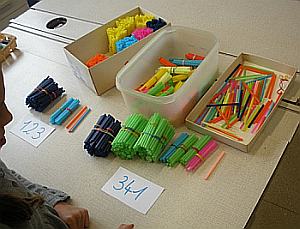 Se il materiale è strutturato in centinaia, decine e unità (come le cannucce dell’immagine qui a sinistra) e il bambino ha capito come sfruttarlo, per fare questa operazione può impiegare anche poco tempo.
