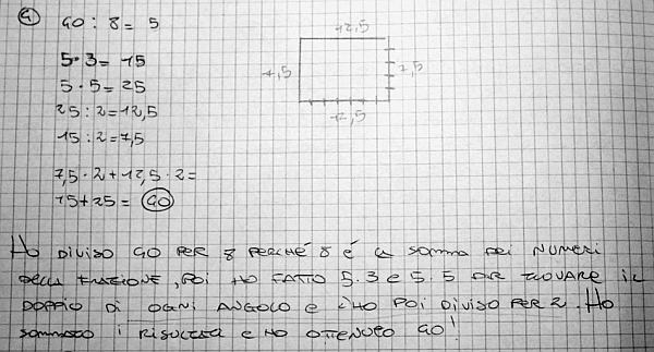 Anche in questo caso l’esposizione presenta sia la forma simbolica sia la forma verbale; a differenza del caso precedente però la struttura della soluzione verbale costituisce una vera e propria spiegazione, leggiamo per esempio: «…ho sommato le frazioni indicanti i lati: 5/5 + 3/5 = 8/5 . Ciò vuol dire che AB + AD = 8/5 AD. Quindi ho diviso 20 (metà del perimetro) per 8».