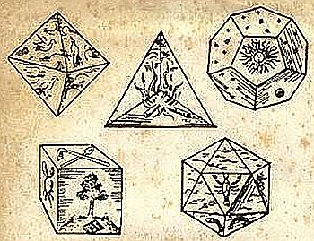 [A sinsitra: I cinque poliedri regolari e la loro simbologia platonica: il fuoco (tetraedro), la terra (cubo), l’aria (ottaedro), l’acqua (l’icosaedro) e la quinta essenza che tutto avvolge e comprende (il dodecaedro)]