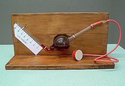 Una ditta nelle vicinanze di Lecco, che lavora il vetro in modo artigianale, ha poi completato l’opera regalandoci la lavorazione del nostro vetro. In più questa ditta, su nostro disegno, ha costruito dei cilindretti in vetro con una base aperta e una scanalatura, per potere applicare una membrana elastica, e provvisti di apposito ugello per fissare il tubo di gomma di raccordo con il tubo a U del manometro.