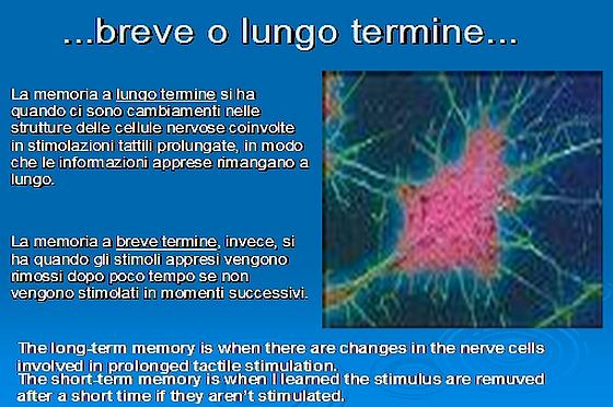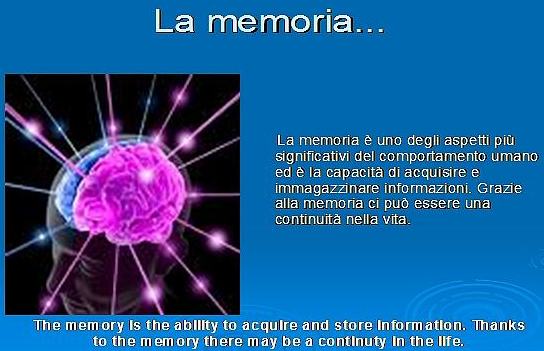 L’esecuzione in classe di semplici esperimenti ha aiutato a riconoscere alcune modalità di funzionamento della memoria e si è rivelata utile soprattutto per gli studenti che ritengono di avere scarse capacità mnemoniche. Ogni tappa del percorso è stata accompagnata da ricerche di testi e di approfondimenti in rete e dalla «comunicazione» dei risultati su diapositive, con una sintesi dei concetti chiave in lingua inglese, come nell’esempio sotto riportato.