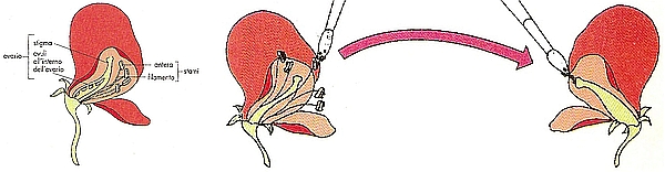 Mendel fecondava artificialmente le piante in questo modo: prelevava,con un pennellino, il polline (gamete maschile) dalle antere di una pianta e lo spargeva sugli organi femminili (sullo stimma, per raggiungere i gameti femminili nell’ovario) dei fiori di un’altra pianta a cui aveva tolto le antere per essere sicuro che non avvenisse l’autofecondazione.