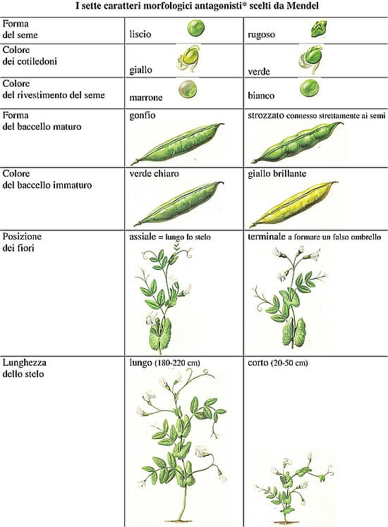 Dopo innumerevoli tentativi di incrocio, identificò un gruppo di proprietà che si manifestavano in due modi differenti (caratteri morfologici antagonisti) e si trasmettevano ereditariamente in modo costante. Nella tabella che segue sono riportati e rappresentati i sette caratteri antagonisti studiati da Mendel. Il carattere dominante in ogni coppia è il primo.