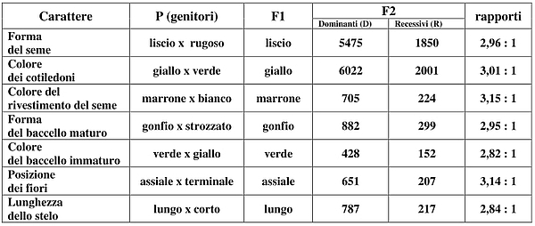 Esaminando gli incroci con tutte le coppie di caratteri considerate vide che, per ogni coppia di caratteri, solo uno di essi si manifestava in ogni individuo figlio, con totale (o quasi totale) esclusione del carattere opposto. I dati numerici sono riportati nella tabella che segue .