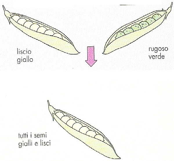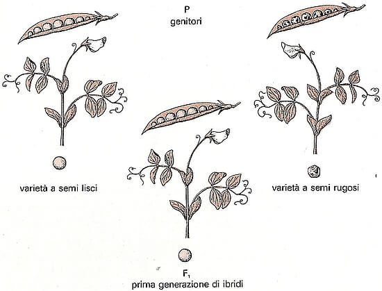 Dall’incrocio tra individui appartenenti alla generazione parentale (P, da parentes genitori in latino), ottenne una generazione di ibridi (F1, prima generazione filiale) in cui tutti gli individui presentano il carattere di uno dei genitori (producono semi tutti lisci), come se il carattere seme rugoso fosse sparito.