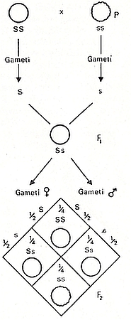 Come si vede nei settori interni dello schema, dall’incrocio si ottengono ¼ + ¼ di individui Ss e ¼ + ¼ di individui ss. Rispettando i rapporti previsti.