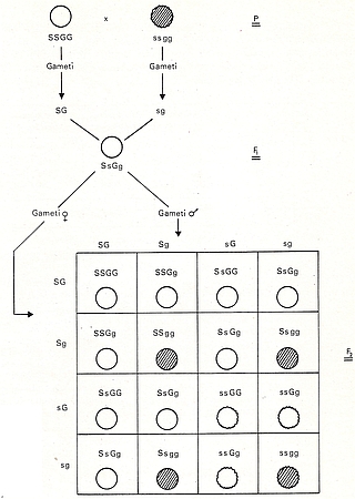 Gli ibridi di prima generazione (F1) hanno entrambi i caratteri dominante e contengono sia gli alleli dominante S e G che quelli recessivo s e g; i loro gameti contengono gli alleli S, G e s, g in proporzioni uguali.