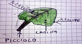 Come si vede nell’immagine a lato, abbiamo disegnato sul nostro quaderno di Scienze una foglia e abbiamo evidenziato le parti che la compongono individuandole e nominandole: il margine (che chiamavano comunque contorno della foglia); la nervatura; il picciolo; la lamina (la parte piatta e allargata).