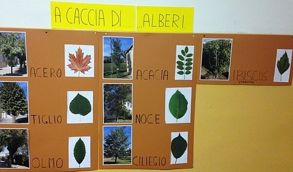 Su ognuno dei sette alberi da «catturare» avevo appeso un cartello con il nome dell’albero così i bimbi potevano riportarlo sul quaderno associandolo alla sua foglia. In realtà gli alberi erano sei perché uno era un arbusto, l’ibiscus.