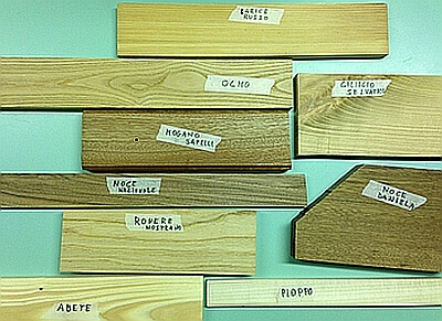 Il papà, mobiliere, della nostra compagna di classe Matilde, ci ha fatto avere alcune tavolette di legno di vari tipi di albero che, noi, in classe abbiamo osservato, toccato, soppesato e annusato (l’unico pezzo di legno ad avere un odore sgradevole era quello del “Noce Daniela”).