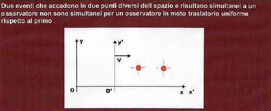 Infatti, due eventi simultanei nel sistema K, non lo sono più nel sistema K’, dato che le loro collocazioni spaziali (x₁, x₂) sono diverse ed altresì diversi risultano, quindi, i corrispondenti tempi (t’₁, t’₂) in K’.