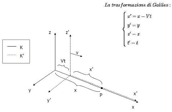 Consideriamo la trasformazione di Galileo fra due sistemi di riferimento (Figura 1). Il sistema K è fisso mentre K’ trasla rispetto a K con moto traslatorio rettilineo uniforme, scivolando con il suo asse x’ lungo l’asse x.