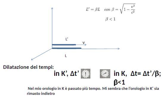 la contrazione della lunghezza L di un righello in movimento con il sistema K’, quando eseguita da un osservatore nel sistema K (contrazione di Lorentz); la dilatazione di un intervallo di tempo misurato in K’, rispetto allo stesso intervallo misurato dall’orologio nel sistema K (Figura 5).