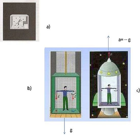 Analogamente, per lo stesso Principio, un astronauta nel vuoto, quando la navicella viene accelerata con una accelerazione a uguale e contraria a quella gravitazionale g (Figura 11c), esperimenta gli stessi effetti come se si trovasse fermo sulla superficie della Terra (Figura 11b).
