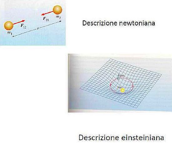 Figura 13: Dalla descrizione di Newton (in alto) a quella di Einstein (in basso). La teoria della gravitazione diventa una teoria geometrica