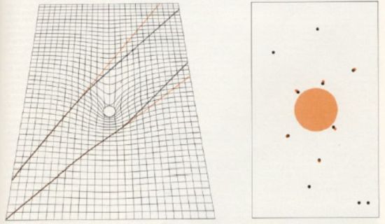 Figura 14 (da V.Fafone, INFN, 2001): Anche la luce, in un campo gravitazionale che modifica lo spazio-tempo, flette la sua traiettoria. Le tracce in colore rispetto a quelle nere, a sinistra, danno un’idea del fenomeno, così come i punti in colore, a destra, descrivono gli effetti di tale deflessione durante l’eclisse solare del 1919
