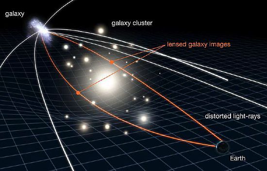 Un analogo fenomeno può anche essere prodotto, per esempio, da parte di un ammasso di galassie, in grado di deviare la luce proveniente da una galassia, quando esso si trovi interposto fra la galassia e la Terra (Figura 15).
