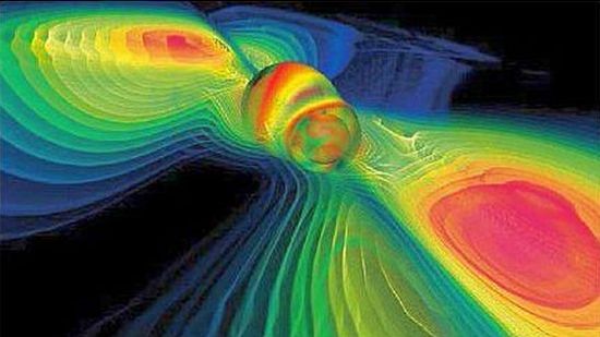 Figura 16: I movimenti di masse, nel loro reciproco avvicinamento, causano vibrazioni dello spazio-tempo in grado di propagarsi come onde gravitazionali