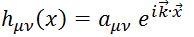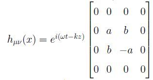 deve soddisfare all’equazione delle onde, la soluzione più generale delle Equazioni di Einstein linearizzate, ha la caratteristica di avere solo componenti trasversali all’asse di propagazione «z», vale a dire due componenti non nulle lungo «x» (seconda riga) (axi = a, b, 0) e lungo «y» (terza riga) (ayi = b, -a, 0).