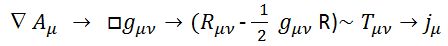 Quest’ultimo deve essere descritto dall’analogo del tetrapotenziale, Aμ, costruito con il potenziale gravitazionale, ϕ, e comparire a primo membro. Sapendo che, ϕ, è già dentro all’elemento della metrica spazio-temporale, gμν, (μ,ν = 1,2,3,4 ) che è un tensore3 (il tensore metrico), ci si aspetta che ad □ Aμ corrisponda un □ gμν.