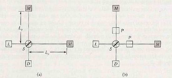 Piccole differenze nella lunghezza dei due bracci, sono evidenziate dalla figura d’interferenza sul detector D. L’aggiunta dei due specchi P in (b), hanno l’effetto di aumentare la lunghezza dei bracci e quindi la sensibilità dell’interferometro [Hartle, 2003, pag. 339].
