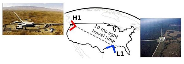 LIGO=Laser Interferometer Gravitational-Wave Observatory. I due interferometri negli Stati Uniti uno ad ovest, Hanford, (Washington), H1, l’altro ad est, Livinston (Louisiana), L1, con bracci perpendicolari di 4 km. Il tempo di percorrenza della distanza fra i due, per un segnale che viaggi alla velocità della luce, è di circa 10 ms [Zendri, 2016].