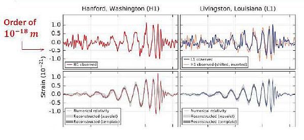 I segnali captati dalle due antenne gravitazionali (H1,L1) (pannelli superiori). In L1 il segnale ricevuto da H1, è sovrapposto per confronto, traslato di circa 10 ms, causa la distanza fra i due ricevitori. La ricostruzione teorica e il confronto con le ricezioni sono mostrati nei pannelli inferiori [Zendri, 2016].