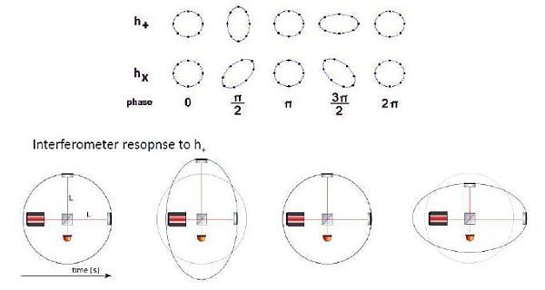 Per semplicità viene considerato solo uno stato di polarizzazione «h+» che «strizza» o «stira» i due bracci in modo sinusoidale, con diverso sfasamento, dando una ragione immediata delle variazioni della figura d’interferenza sul detector D.