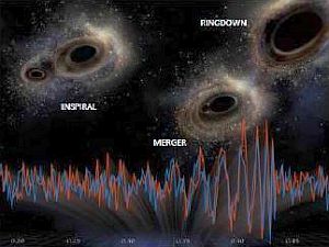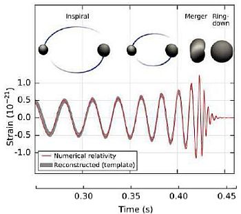 Le caratteristiche dell’evento sono interpretabili con la coalescenza di due BH (black hole, Figura 8), vale a dire la fase iniziale di spiraleggiamento orbitale (orbital inspiral), il loro fondersi (merger) e infine la trasformazione del sistema binario in un unico black hole.
