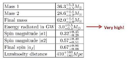 Le caratteristiche del merger sono sintetizzate nella Tabella in Figura 9. Particolarmente rilevante è l’energia che va in onde gravitazionali, pari a circa 3 MO (MO = massa del Sole)