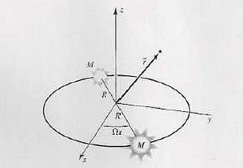 Con riferimento alla Figura 10, il problema a due corpi di massa M si riconduce a quello di una massa ridotta μ, pari a M/2, orbitante attorno ad un punto fisso a distanza 2R dove è concentrata la massa totale del sistema, Mtot, pari a 2M.