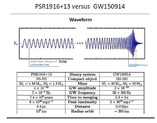 Confronto fra sistemi binari (vedi testo). Le diverse frequenze delle onde gravitazionali nei due sistemi, sono ricavabili dalle equazioni sopra esposte [Zendri, 2016].