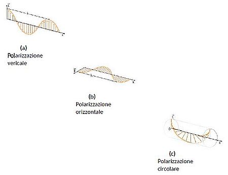 Polarizzazione verticale (a), orizzontale (b), circolare (c) di un’onda elettromagnetica.Se