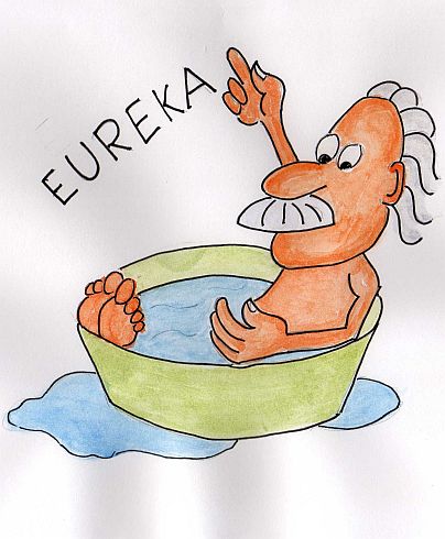 Sembra che per la contentezza di avere avuto questa idea Archimede sia balzato fuori nudo dalla vasca e, senza rivestirsi, abbia incominciato a correre per le vie della città gridando eureka (che in greco significa «ho trovato»).