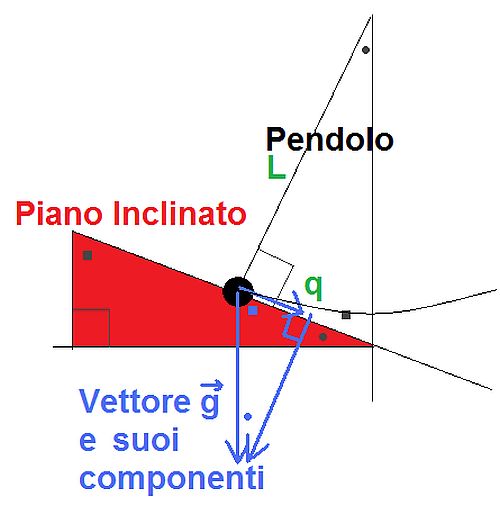 Possiamo immaginare il piombo del pendolo, in questa nuova posizione, come giacente su un piano inclinato esattamente come la perpendicolare al filo del piombo in quel momento.
