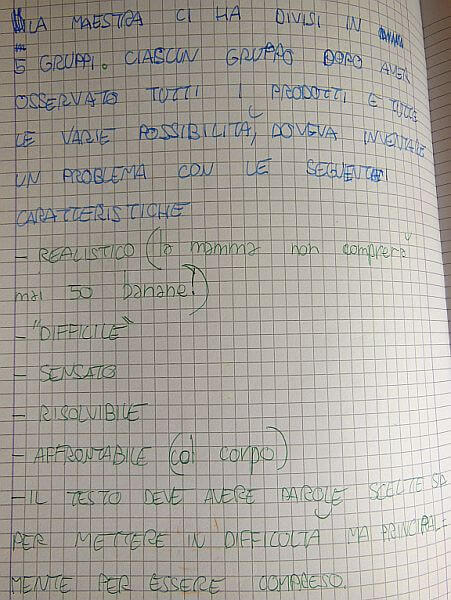 Infine, l’attività settimanale del «matemercato» è stato il contesto per un importante lavoro sui problemi, nel quale sono state proposte e analizzate diverse situazioni problematiche relative alla compravendita. Ai bambini è stato chiesto di inventare – lavorando a gruppi – testi di problemi relativi ai contenuti acquisiti, seguendo alcune precise condizioni (si veda la Figura n. 18); poi tali problemi sono stati esaminati, discussi e risolti insieme.