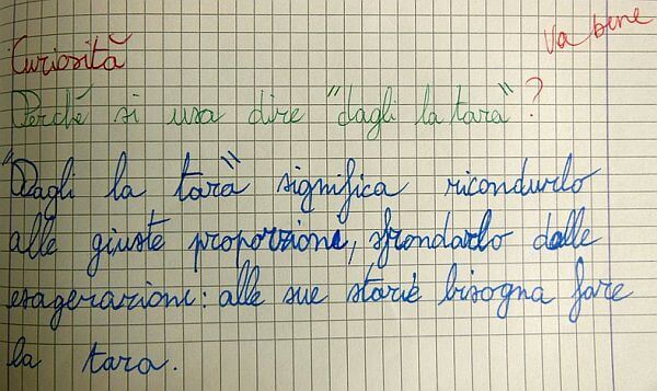 Infatti, viene chiesto ai bambini l’uso di nuovi termini, di nuove parole che esprimano i concetti conquistati, per poi giungere a utilizzare in modo preciso e sistematico i simboli della disciplina, simboli che permettono di esprimere le relazioni e i rapporti con un linguaggio preciso e sintetico. A titolo di esempio, nella Figura n. 22, si può vedere una interessante riflessione sulla parola «tara».