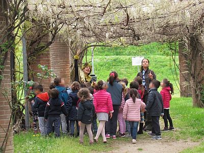 C’erano tante piante diverse, alcune avevano le gemme altre no; la natura si stava risvegliando e il Sole era più caldo di quando si andava a scuola d’inverno, l’erba cominciava a spuntare. C’era un glicine meraviglioso: i bambini si sono accorti che il glicine è rampicante. Insieme si è anche scoperto che il tronco del glicine è grigiastro, non marrone come nelle figure che compaiono sui libri.