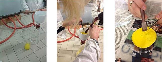Al termine del trattamento si estrae il crogiolo dal forno e si versa il liquido su lastra di acciaio o in stampi di grafite per favorirne un rapido raffreddamento. Gli studenti possono osservare le diverse colorazioni impartite da ossidi diversi e la diversa intensità del colore a seconda della quantità di ossido aggiunto.