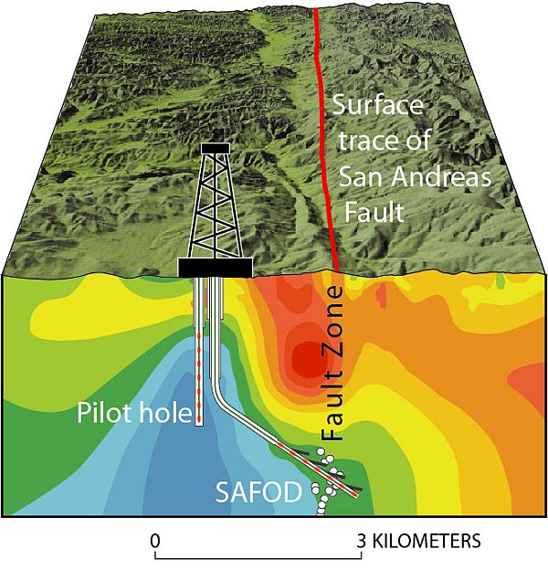 [A sinistra: Schema della tecnica utilizzata dal progetto di ricerca San Andreas Fault Observatory at Depth (SAFOD) che, sfruttando un profondo pozzo di perforazione, raccoglie dati geochimici e meccanici in corrispondenza della faglia sismogenetica di San Andreas (California) (earthquake.usgs.gov/earthquakes/)]