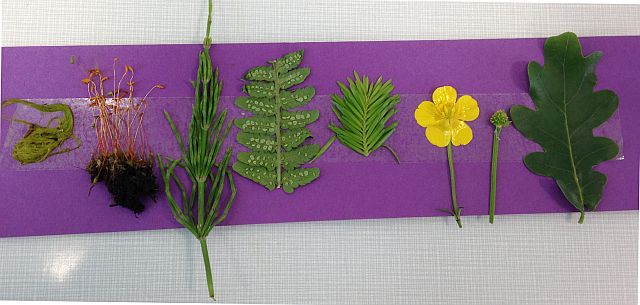 Un’alga, un muschio, il fusto sterile di un equiseto, parte di una foglia di felce in cui si vedono bene le spore, un pezzetto di ramo di tasso, un fiore di ranuncolo, il suo ovario, una foglia di quercia.